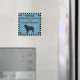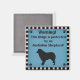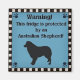"Varning! Kylen skyddas av en Australian shepherd!" Med en silhuett av australian shepherd på blå bakgrund, omgiven av ett svart och vitt schackrat gräns och svart tassavtryck i varje hörn.