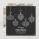 Svart bakgrund med vitt modernt stil, dekorativ jul bollar på stringor med små bögar, God jul känslor och vitt dekorativt ram. Baksidan har foto och text som du kan anpassa.