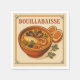 Square napkin design featuring the classic French dish Bouillabaisse in a refined retro vintage style. Central illustration of a rustic bowl filled with rich saffron seafood broth, showcasing fish fillets, mussels, shrimp, and aromatic herbs, with slices of toasted rouille-topped bread on the side. Warm Mediterranean retro color palette: deep orange, saffron yellow, cream, muted blue, olive green. Light aged-paper texture background. Subtle retro French coastal border. Add elegant vintage typography: “Bouillabaisse”. Balanced, appetizing composition, high-resolution for printing.