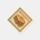 Square napkin design featuring classic Greek Moussaka in a warm retro vintage style. Central illustration of a baked Moussaka slice with golden béchamel top, layered eggplant, spiced minced meat, and tomato sauce. Color palette: warm gold, cream, muted red, soft brown, olive green. Light textured aged-paper background. Greek-inspired ornamental border with subtle geometric motifs. Add elegant vintage typography: “Moussaka”. Balanced, appetizing composition, high-resolution for napkin printing.