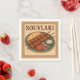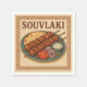 Square napkin design featuring traditional Greek souvlaki in a warm retro vintage style. Central illustration of grilled skewers with juicy marinated meat, char marks, pita bread, tomatoes, onions, and a small serving of tzatziki on the side. Mediterranean-inspired retro color palette: warm gold, cream, muted blue, terracotta, olive green. Light textured aged-paper background. Subtle Greek ornamental border resembling classic Hellenic meander patterns. Add elegant vintage typography: “Souvlaki”. Clean, appetizing, balanced composition, high-resolution for napkin printing.