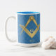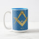 Snyggt guld kvadrat och kompass Masonic-symbolen personlig kaffe mugg med blå plaid-bakgrund.