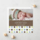 Det här toppen snygga födelseattentatet innehåller ett landskapsfoto av ditt nya tillägg på den bruna remsan med babyens födelsedetaljer under och ljusblå, ljust grönt och bruna polkadoter på grund.