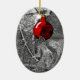 Pen and ink drawing of a squirrel climbing in a Christmas tree. The squirrel is surprised by seeing its own reflection in an ornament. The shiny red ball stands out against the black and white drawing, emphasising how strange it must be to the squirrel to see itself.