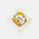 En papper napkin med en söt ekorre som står bakom några orange vattenfärgspumpor. En lövkrans omger dem med en ekblomma från löv och orange och andra sprit och löv. Bakgrund är en digital bild för vintagen.