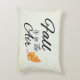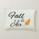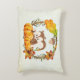 framtill på kudden med en söt ekorre bakom några orange vattenfärgspumpor. En lövkrans omger dem med en ekblomma från löv och orange och andra sprit och löv. Baksidan av kudden har en typografi som säger att Fall är i luft. Bakgrunden bakom bilden är en bild av en faux vintage parchment i en kräm färg, med en grov åldras runt kant.