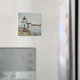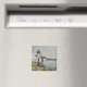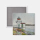 Squirrel Point Lighthouse sits on the banks of the Kennebec River in Maine on a dark misty day. The opposite bank near Phippsburg is shrouded in fog. Lichen grows on the bell house roof and the rocks in the foreground. New spring grass springs up around the brush still bare from the long winter. Sargassum laps against the rocky shore showing how close the lighthouse is to the water.