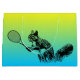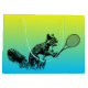 Du har redan hittat perfektens gåva till tennis fläkt i ditt liv, lägg nu till den avslutande beröringen och slå in den i stil! Den här tropiska presentsäcken för blått och gult har en ekorre som håller en tennisracket på båda sidor. Lägg bara till mjukpapper och du är redo för födelsedagspressen. Visa din favorittennistränare eller teammat hur väl du känner dem och se till att din present står ut vid party!