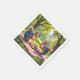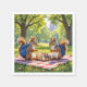 Two squirrels with blue backpacks are playing chess on a red and white checkered blanket in a sunlit park