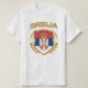 Serbiens nationella flagga infiltreras i ett faux guld-skölsystem som i sig vilar på faux guld laurel löv. land namn läggs till ovanför bilden.