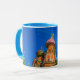 Stängningsvy över domarna i St. Basils katedral på Röda torget i Moskva, Ryssland, mot blå himmel. Katedralen är också lika känd som Vasily som den välsignade katedralen och som katedral för den mest Heliga teotokos-pjäsen på Moat. Den följdes 1561. Katedralen har inga analoger av tidigare, tidigare, contemporary eller senare arkitektur av muslimsk och bysantinsk kulturtradition. Kaffe mugg.