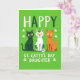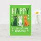 Det här kortet visar tre stiliserade katter som står i rad i mitten av en klar limegrön bakgrund, vilket ger hela scenen en festlig St. Patrick's Day-känsla 💚. En katt är smaragdgrön, den nästa är vit med gröna fläckar som ser ut som shamrockar, och den tredje är en rödbrun tabbykatt, alla sitter prydligt sida vid sida som om de poserar tillsammans. Deras gula ögon och små rosa näsor ger en förförisk charm, och de små vita hörntänderna som sticker ut får dem att se ut som om de delar ett skämt med betraktaren. Katternas stadiga, framåtriktade blick känns som en vänlig knuff som är tänkt just för en dotter, med trioens nära avstånd som antyder en mysig, tillgiven relation. Längs toppen står “HAPPY” med alternerande mörkgröna och vita bokstäver, jämnt fördelade ovanför deras huvuden. Längs botten visas “ST. CATTY'S DAY DAUGHTER” i stor