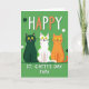 This greeting card shows three stylized cats posed close together on a rich emerald green background, giving the scene a cozy St. Patrick’s Day feel 💚. One cat is deep forest green, another is white with lime spots, and the third is an orange tabby, and their bodies lean in as if they’re sharing a friendly secret. All three have wide yellow eyes and tiny pink tongues that add a teasing, affectionate look between them. Above the cats, the word “HAPPY” sits near the top in slightly textured letters, mostly white with one orange “P” that stands out. Small shamrocks are sprinkled around the heading like confetti, adding a festive touch ☘️. Below the trio, the line “ST. CATTY’S DAY PAPA” is placed as the main message, centered under their faces. The cats’ bright eyes and rounded shapes pop against the green field, with the shamrocks floating around the top text.