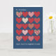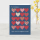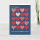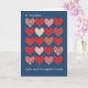 Ett chic hälsningskort att anpassa för St Dwynwens dag (25 januari) med rader av röda och vita mönstrade hjärtan på en djupblå bakgrund. St Dwynwen är Wales skyddshelgon för älskande och denna St Dwynwens-dagsdesign är från en handmålad papperscollage av Judy Adamson.