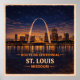 Celebrate the "Gateway to the West" with this St. Louis Missouri Centennial poster. Commemorating the 100th anniversary of Route 66, this vintage-style artwork features the majestic Gateway Arch towering over the St. Louis skyline at twilight. The city lights and the iconic monument are reflected beautifully across the Mississippi River under a brilliant, star-filled sky, capturing the historic grandeur of this essential Mother Road stop.