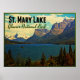 I denna utformning av vintage resor har bergsområdena, skogen och det vackra St Mary Sjö vid Glacier National Park satt sin höjdpunkt i snö.