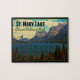 I denna utformning av vintage resor har bergsområdena, skogen och det vackra St Mary Sjö vid Glacier National Park satt sin höjdpunkt i snö.