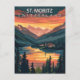 Celebrate the glamour and heritage of the world's oldest ski resort with this St. Moritz Travel Postcard. This vintage-style illustration captures the high-altitude elegance of the Engadine, featuring the sun-drenched slopes and the iconic frozen Lake St. Moritz, famous for its 'White Turf' horse races.