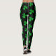 These St. Patrick’s Day leggings feature a bold all-over shamrock pattern set against a deep black background, creating a striking contrast that immediately stands out. The clovers are rendered in a green faux glitter effect, giving the appearance of sparkle while remaining smooth and comfortable to wear.