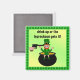 Leprechaun on Pot © Sunny Mars Design. St patrick's day kvadratmagnet har en tecknad som illustrerar en leprechaun sitta på en depå av guld med arm uppe i luft och en pistol riktad mot huvudet med ord "drick upp eller så får leprechaun det!" under den.