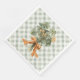 This St Patrick's Day napkin design features a watercolor four leaf clover arrangement tied with and orange bow and a coordinating green and white gingham background on the front and on the back.