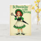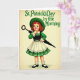 This card shows a vintage-style St. Patrick’s Day scene with a cherubic young girl posed as if she’s sharing a secret with a close friend. Her red corkscrew curls spill from under a wide emerald hat, and her bright blue eyes glance upward while one finger rests gently at her chin, giving her a tender, teasing look. She wears a green long-sleeved top with a black bodice, and a crisp white apron with ruffles along the hem drapes over a green checkered skirt. White lace trims her collar and cuffs, softening the outfit the way a careful touch softens a familiar hug. Behind her, a closed black umbrella leans diagonally, its dark shape cutting across the pale background like a quiet companion waiting nearby. Near the top, the phrase “St. Patrick’s Day in the Morning” appears in verdant green lettering, centered above her head, adding a festive note 💚☘️. The backdrop is a creamy beige with a lightly aged texture, and the umbrella handle curves upward beside her shoulder.