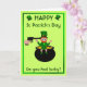 Solig © fördärvar designer. Trollsitta på en kruka av det guld- st patrick's dayhälsningkortet - denna presenterar dagkortet för St Pats en tecknadillustration av en trollsitta på en kruka av guld med hans ärmar upp i luften, och ett vapen som pekas på hans huvud med ord ", gör dig den lyckliga känselförnimmelsen?", skriftligt nedanfört.