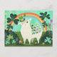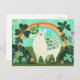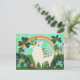Ett flytande vitt får som är klädt i grönt- och varm jacka i flera färgader omges av magisk blomning av grönt klöver och vår. En regnbåge visas ljusa i bakgrunden.