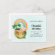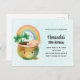 Födelsedagsinbjudan med en bedårande illustration med en leende grön och gul kruka med en söt regnbåge,