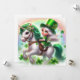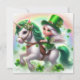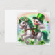 Söt St Patrick-flicka som bär en leprechaunhatt som rider på en magisk enhörning Semesterkort med en regnbåge och klöver