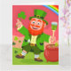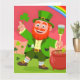 En glad och livfull 2D-illustration i tecknad stil föreställande en lycklig leprechaun som firar St. Patricks dag. Figuren är iklädd en klassisk grön kostym och hög hatt med guldbrosch, och sportar ett ljust rött skägg. Han håller i en fyrklöver i ena handen och en grön dryck i den andra, stående bredvid en röd gryta fylld med guldmynt. Scenen utspelar sig på en grön äng prydd med treklöver under en rosa himmel och en strålande regnbåge.