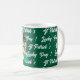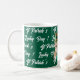 St Patrick's Lucky Day Cute Cat with Leprechaun Hat, generative content on your coffee mug. The cat is emerging from the green background with greetings and keep his paws on a shamrock. You can change the cat's photo with your own, using the Remove Background option, and keep the rest of images, if it is needed you may align the hat on your cat's head. A nice Irish liked mug gift for cat lovers.