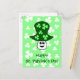 En svamp i tecknaden med en översta grönt formad som en leprechaun-hatt. Hatten har schamponfläckar. Den vita stjälken ler. Bakgrunden är blekens grönt med en vit schamprock mönster. Det står "Lycklig St. Patrick's Day" på framsidan.