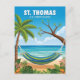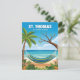 En randig hängmatta hänger från en palmkvist över en sandstrand med havet och himlen i bakgrunden.
