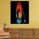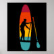 Den här poster innehåller en illustration av en SUP eller en stående padelbräda och paddel som skildras i vibrant sunset färg med en silhouette-illustration i svart på någon som paddlar ombord. Bilden ställs in mot en svart bakgrund.