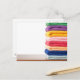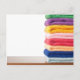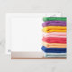 Stack av färgade mikrofiberhanddukar på bord mot vit bakgrund