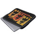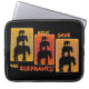 Laptop sleeve har kompakta husvagnar av elefanter som staplas tre på hög mot bakgrund av orange, guld krossade löv på svart. Meddelande på framsidan, "Hjälp! Spara Elephants" är att uppmuntra stöd till Världsnaturstiftelsens insatser. (IconDoIT har utlovat 100 procents vinst från försäljningen av väskan till WWF)