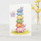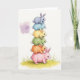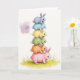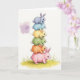 Designed with a tall, centered stack of six rounded bunnies 🐰, this illustration guides your eye upward in a gentle vertical line. Each bunny wears a different soft pastel shade—lavender at the top, then sky blue, sunny yellow, mint green, warm peach, and blush pink at the base—like friends leaning close to stay together. They have large dark eyes, pink inner ears, and small white tails, and their snug poses suggest affectionate support and shared trust. Near the top, a soft purple cloud floats at the upper left, adding a dreamy accent against the wide white background 🌷. The bunnies stand on a loose patch of green grass along the bottom, with brushy texture that keeps the scene light and airy. A short greeting sits near the top in a light purple color, with smaller text placed beneath it in a softer gray. The grass shows layered green strokes with a slightly darker edge along the lower border.