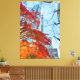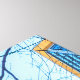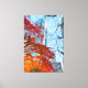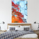 Bilden fångar upp en levande cityscape-scen under hösten. En lång, modern skyscraper med blåfärgade fönster växer i bakgrunden, delvis fördunklad av ett par träd med ljusröda löv och orange i förgrunden. Bare träd grenar når fram till ljusa blå himmel. Den nedre delen av bilden visar en byggnad med klassiska arkitektoniska detaljer.
