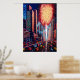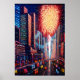 Nyårsdagen i staden vid havet och med fyrverkerier i himlar, många bilar på motorvägen i staden. Det här är en AI-skapad konst.