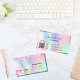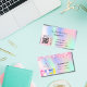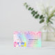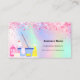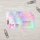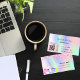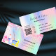 En elegant och glamoröst affärskort på holografisk bakgrund, rosa, lila, myntkondenserad grönt som dekoreras med rosa konfetti på fram- och städning utrustning. Anpassa och lägg till ditt namn, kontaktinformation för text och din egen QR-kod till webbplatsen adress.