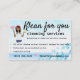 Affärskort med vita ljusblå brickor och bubblor bakgrunden bild i städning dam med karamellfärgad hudfärg med brunt hår och brunt öga i en vit t-shirt och jeans som håller städning tillbehör till verktyg och rosa. Det finns gott om utrymme för att redigera företagsinformation och skrivans slogans med mera. Gör ett eget affärskort för personligen.