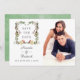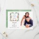 Snöig rustik tall och gran blomster vattenfärg jul bröllop spara datum med en salvia grön vattenfärg tvätt bakgrund.
