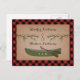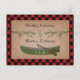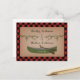 Ett bröllop rädda datum vykort med en illustration av två städsegröna trädgrenar och en grön kanot. Bakgrunden är röd och svart rutig. Anpassa texten.