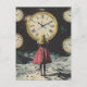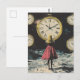 En flicka med långa, blond hår står med henne tillbaka till tittaren och tittar på ett surrealistiskt landskap fyllt med guld fickur. AI genererade fantasykonst
