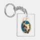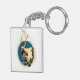 En målning av en tjurälk med en komjölk inom en blå cirkel som är inramad av ett träd gren som är täckt av grönt löv. Du kan välja en bakgrund färg för den här nyckelkedjan. Bild Copyright ©2022 Kimberly J Tilley. zazzle.com/store/kimberlyjt