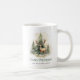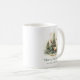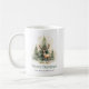 Mugg med en vacker vattenfärgsmålning av ett lager framför Julgranar. Grönt "God jul" och anpassade namn nedan.