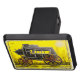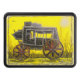 En Mörk Trästrumpa sitter under ett skrapande ökenlandskap i sol på ett ött smutsat väg bland kaktus medan fåglar flyger över. Den svarta färgen i gammala västern på gultens bakgrund med en barbwire gräns utanför kant i bilden, där man lägger till en grov persona och vass kant om vad ett av Gammala västern-lägena transport var. Stagecoach-formulering ovanför bilden med gamla stil-bokstäver.
