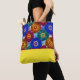 A beautiful abstract floral stained glass style pattern decorates this reusable tote bag. The bottom third (approx.) is a coordinating solid with a thin stripe. Generated with AI by IveyCottage.