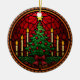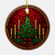 This striking round ceramic ornament captures a beautiful, traditional indoor holiday scene in a vibrant stained glass style. A fully decorated Christmas Tree sits on a hearth, surrounded by glowing taper candles and festive greenery, all set against a dramatic, ruby-red background. The warm colors and classic imagery evoke a sense of coziness, reverence, and holiday tradition. This piece is a wonderful Christmas keepsake and makes a heartfelt holiday gift for anyone who cherishes the traditional, soulful side of the season.